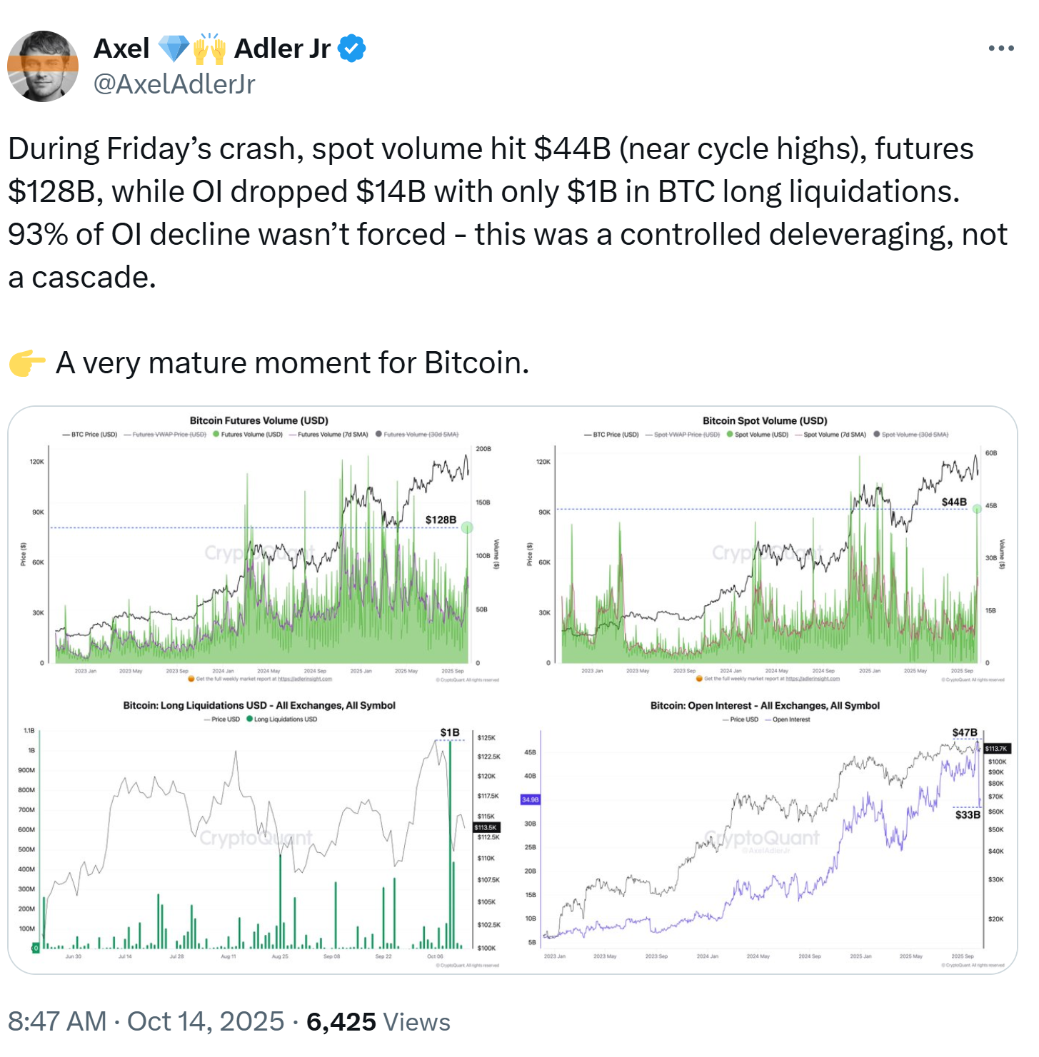 Аналітики Cryptoquant заявили, що дані пропонують впорядковане скидання ринку, а не панічний колапс. З 14 мільярдів доларів, витертих від відкритих відсотків, приблизно 93% представляли контрольоване делеверигування, і лише 1 мільярд доларів Longs Bitcoin був ліквідований.