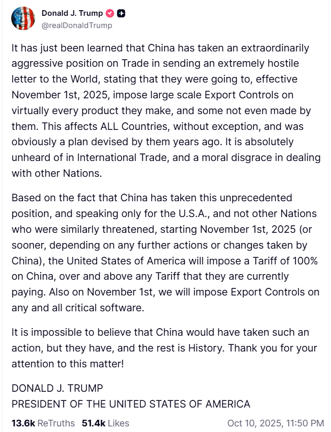 «[…] починаючи з 1 листопада 2025 року (або раніше, залежно від будь-яких подальших дій або змін, вжитих Китаєм), Сполучені Штати Америки введуть 100% тариф на Китай понад будь-який тариф, який вони зараз сплачують», — написав Трамп у дописі Truth Social від 10 жовтня.