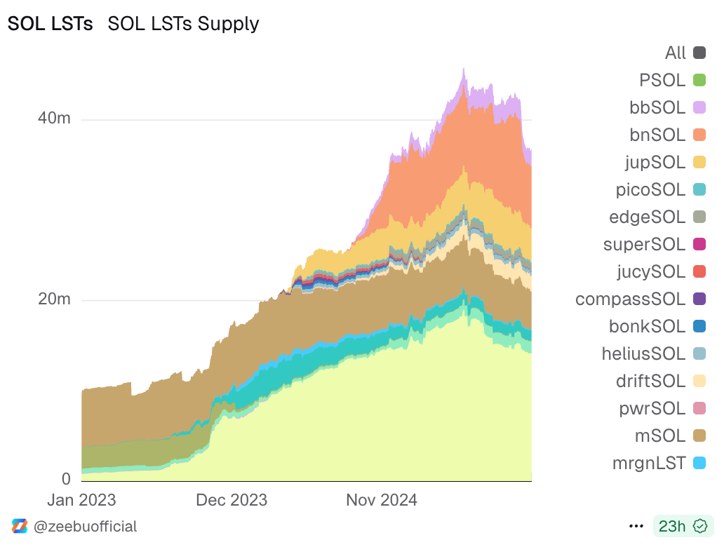 Подібно до ефіру, пропозиція LST Solana подвоїлася з 20 мільйонів у січні 2024 року до приблизно 40 мільйонів на момент написання статті, причому загалом 67% пропозиції токенів Solana зараз заблоковано в смарт-контрактах стейкинга.