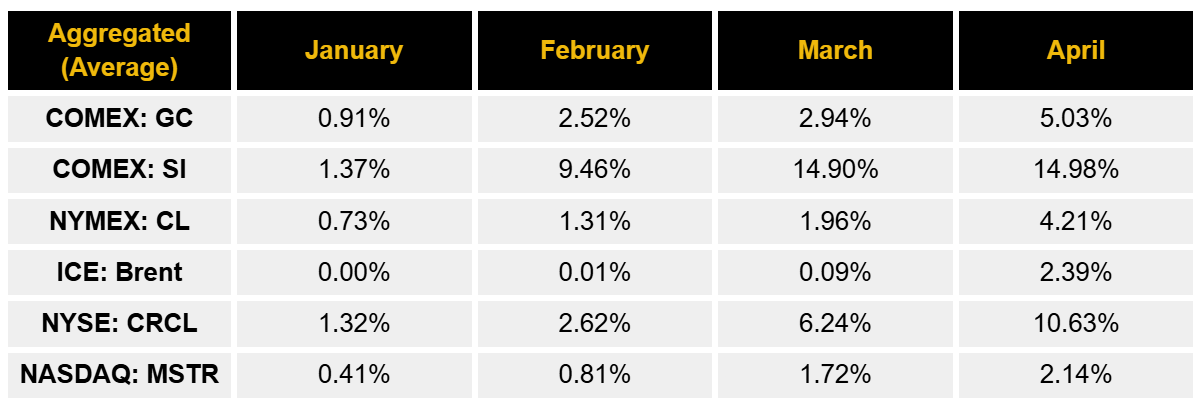 У березні та квітні токенізоване срібло становило 14,90% та 14,98% обсягу Comex відповідно, порівняно з лише 1,37% у січні.