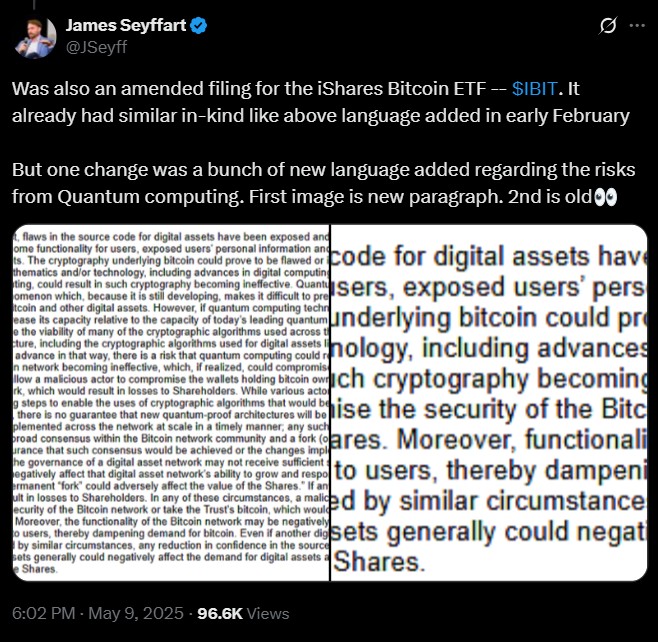 9 травня BlackRock оновив заяву про реєстрацію для свого Ishares Bitcoin ETF (IBIT). Переглянута версія вирішила потенційні ризики для цілісності мережі Bitcoin, що створюється квантовими обчисленнями, показує подання.