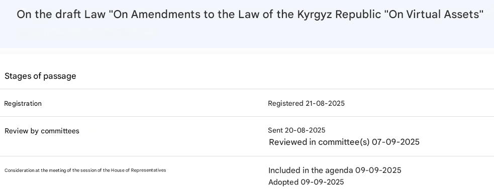 Представлений міністром економіки та комерції Бакайт Сидіков, законопроект стосується декількох аспектів прийняття криптовалют Киргизстану, включаючи створення юридичної бази для видачі та обігу стабілій, токенізованих активів у реальному світі (RWAS) та державних операцій промисловості.