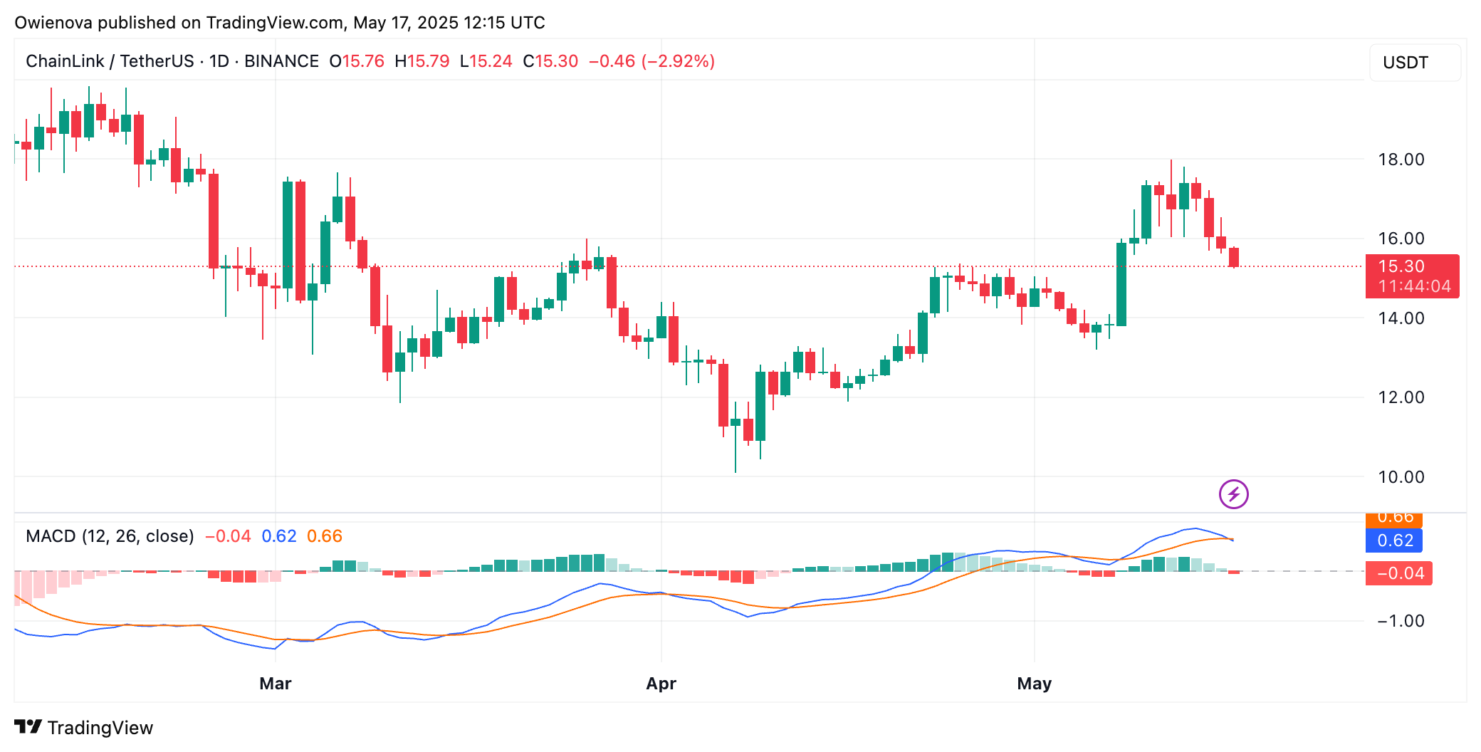 Cryptowzrd планує завтра відстежувати внутрішню діаграму для потенційної установки перевороту над позначкою $15,85, яку він розглядає як першу ознаку бичачих намірів. Однак стійкий крок вище $16,80 запропонує більш підтверджений прорив та більш сильну тривалу можливість, що свідчить про те, що покупці починають брати під контроль.