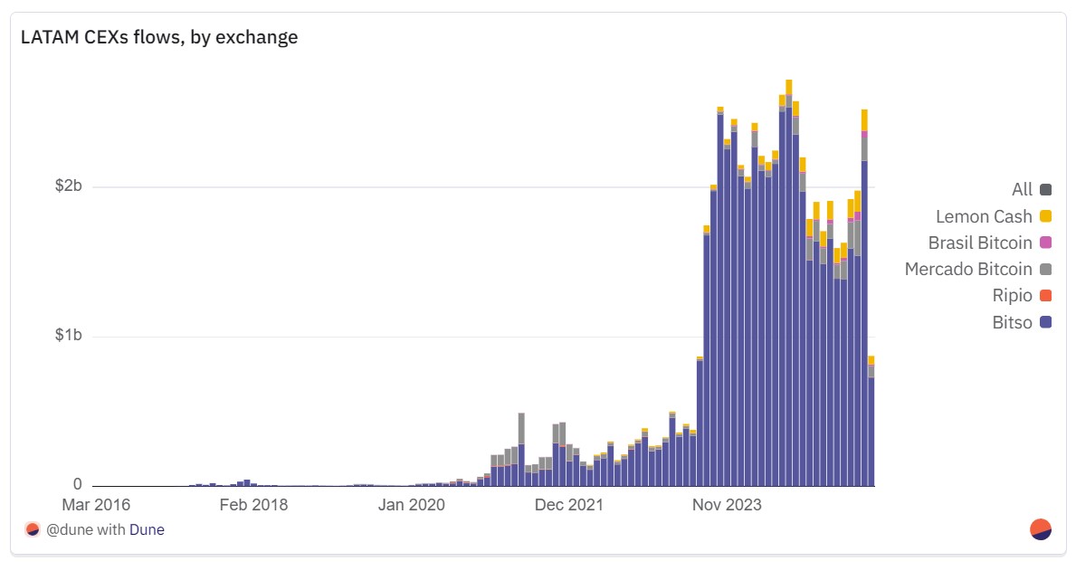Звіт про Latam Dune Research показав, що 2021 щорічні потоки біржі в регіоні становили 3 мільярди доларів. У 2024 році загальний обмінний потоки на Латам досяг 27 мільярдів доларів, що на 800% за три роки, що сигналізує про зростання цифрових активів у регіоні.