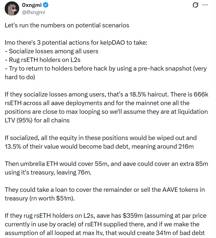 Псевдонімний засновник аналітичної платформи DeFiLlama, 0xngmi, окреслив три рішення, включаючи можливість «соціалізувати» збитки серед усіх користувачів, «власників rsETH на L2» або спробувати повернути баланси власників до моментального знімка до злому, що було б «дуже важко зробити», написав він у дописі X у понеділок.