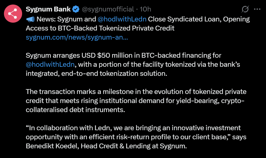 Об’єкт Sygnum-Ledn підпадає під токенізований ринок приватних кредитів, тепер найбільший і найшвидше зростаючий сегмент токенізації активів.