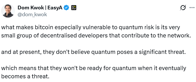 Інші, такі як засновник Capriole Investments Чарльз Едвардс, розглядають квантові обчислення як потенційну «екзистенціальну загрозу» для біткойнів, стверджуючи, що оновлення необхідно зараз для посилення безпеки мережі.