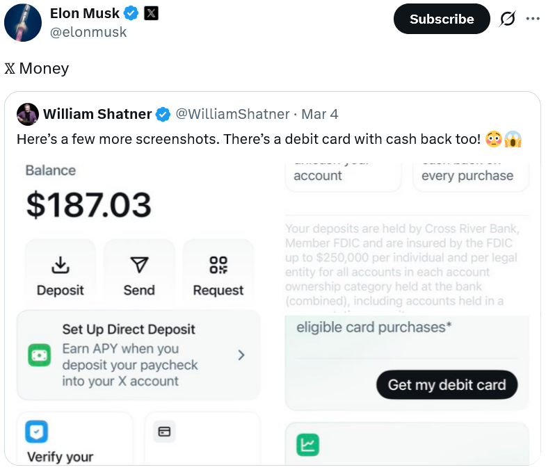 Кілька скріншотів, якими поділився Шатнер, показують, що користувачі X Money зможуть отримувати кешбек на певних покупках карткою та отримувати 6% річних процентних доходів від депозитів.