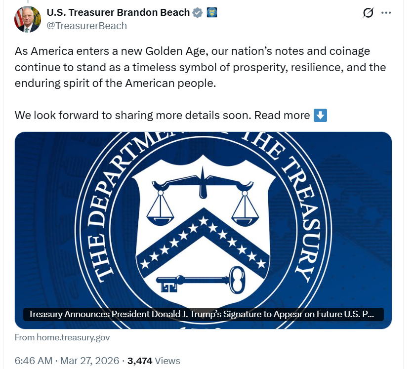 У четвер Міністерство фінансів США повідомило, що цей крок відзначатиме 250-річчя США. Це поставить підписи як Трампа, так і міністра фінансів Скотта Бессента на майбутніх банкнотах США.