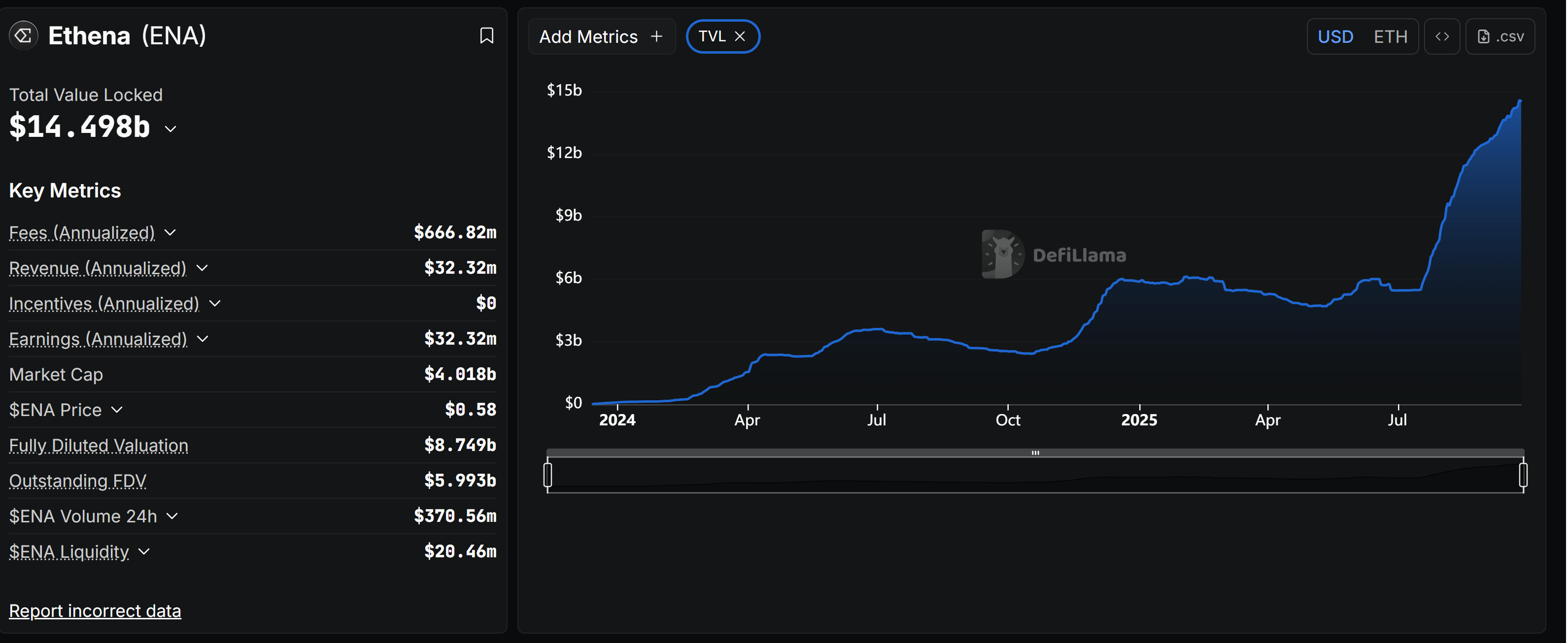 Згідно з його веб-сайтом, активом Etena, що несе вдосконалення, Susde в даний час пропонує річну відсоткову дохідність (APY) в розмірі 6%, що знизився порівняно з середнім показником у 2024 на 19%. Проект залучав понад 811 000 користувачів у 24 мережах блокчейн.