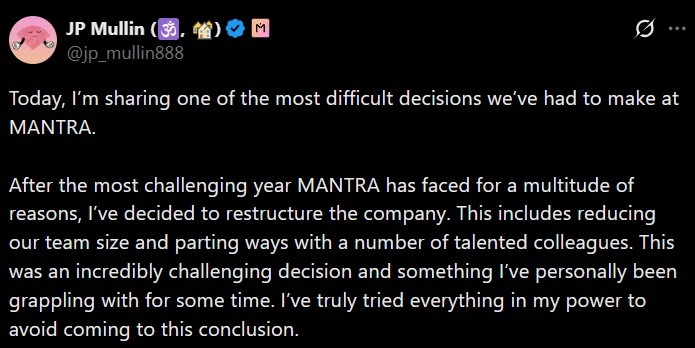 Mantra, блокчейн-проект, зосереджений на реальних активах (RWA), реструктуризує свою діяльність після того, як його керівництво описало як найскладніший рік в історії компанії, відзначений різким крахом токенів і тривалим тиском на ринку.