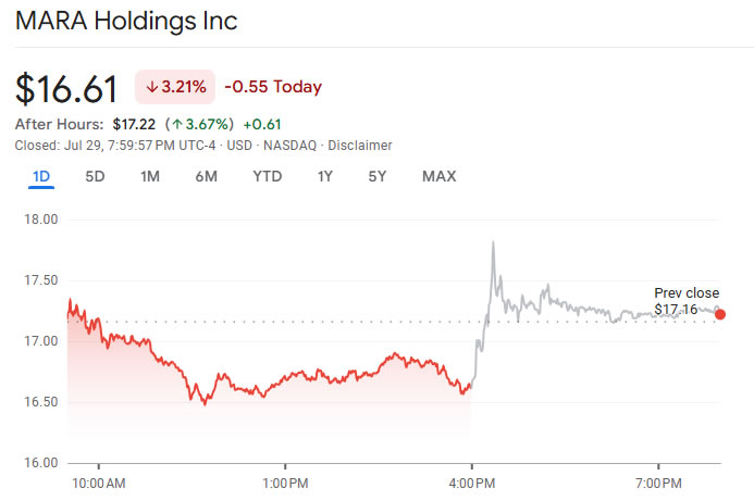 З випуском заробітку, акції в Mara Holdings (MARA) зросли до максимуму на 7,5% у торгівлі після годин у вівторок до 17,82 долара до охолодження до 17,22 долара.
