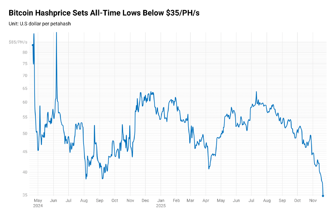Hashprice, який відстежує дохід майнерів на одиницю обчислювальної потужності, впав нижче 35 доларів США за хеш, опустившись нижче середньої сумарної ціни хешування 45 доларів США/PH/с, яку повідомляють публічні майнінгові компанії. Через падіння кілька операторів наближаються до рівня беззбитковості.
