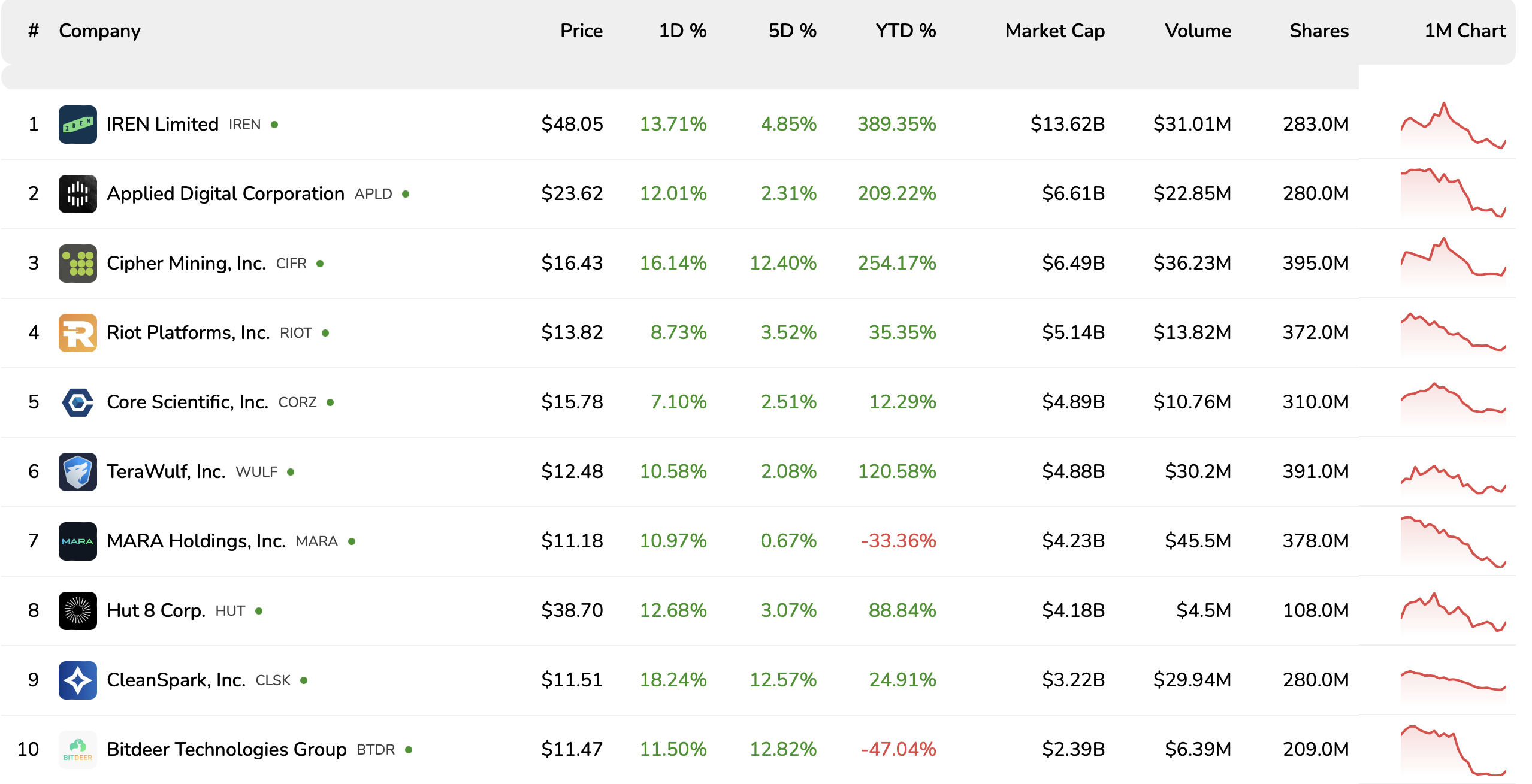 Незважаючи на погіршення економіки сектора, десятка найбільших майнерів, що торгуються на біржі, виросла за останні 24 години, а CleanSpark, Cipher Mining і IREN показали двозначне зростання в понеділок.