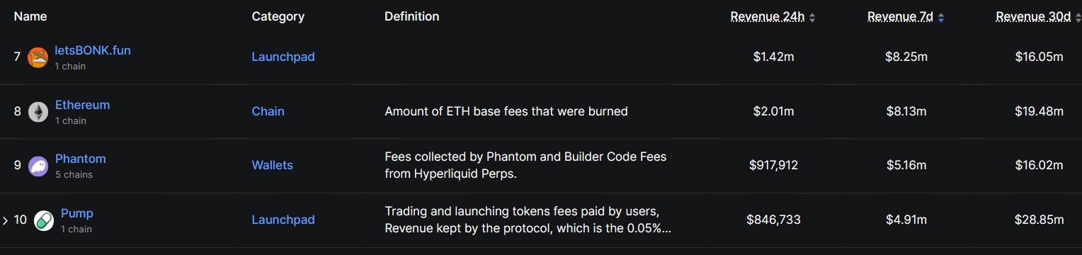 Поки Летсбонк набирає тяги, Pump. Fun залишається домінуючим в інших аспектах. Дані Defillama показують, що платформа Memecoin залишається найкращим запуском у 30-денному доході протоколу, заробляючи майже 29 мільйонів доларів.