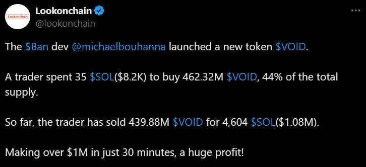 Після запуску мемекойна один трейдер витратив 35 Solana (SOL) вартістю приблизно 8200 доларів США на придбання 462 мільйонів токенів VOID, що становить 44% від загальної пропозиції. Лише через 30 хвилин після покупки токена гаманець продав 439 мільйонів токенів за 4604 SOL на суму понад 1 мільйон доларів.