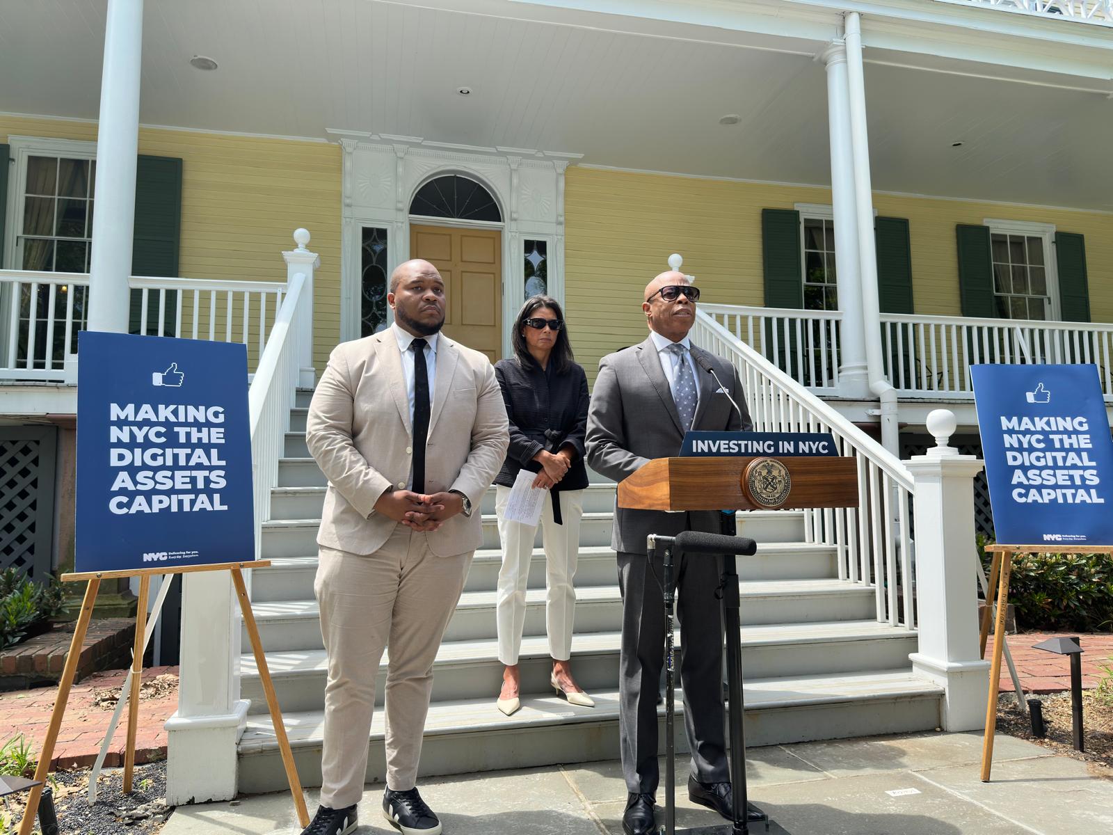 На прес -конференції 12 травня в особняку Грейсі, офіційній резиденції міського мера міста, Адамс заявив, що червень ОУ, засновник фігури компанії Financial Services та Річі Хекер, генеральний директор приватної фірми та масштабу, допоможуть місту у своїх криптовалютах. Він говорив про ОУ та Гекера, що виступають радниками наступних кроків Нью -Йорка в галузі “економічного розвитку та можливостей обслуговувати громадськість, використовуючи цифрові активи”.