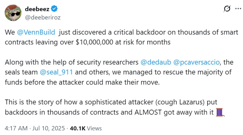 У четвер псевдонімний дослідник мережі Venn Deeberiroz поділився в пості X, що задній експлуатація на задній частині не загрожує екосистемі протягом місяців. Дослідник заявив, що експлуатація націлена на неініціалізовані договори про проксі-сервер ERC-1967, що дозволяє їм викрасти договори до того, як вони були належним чином налаштовані.
