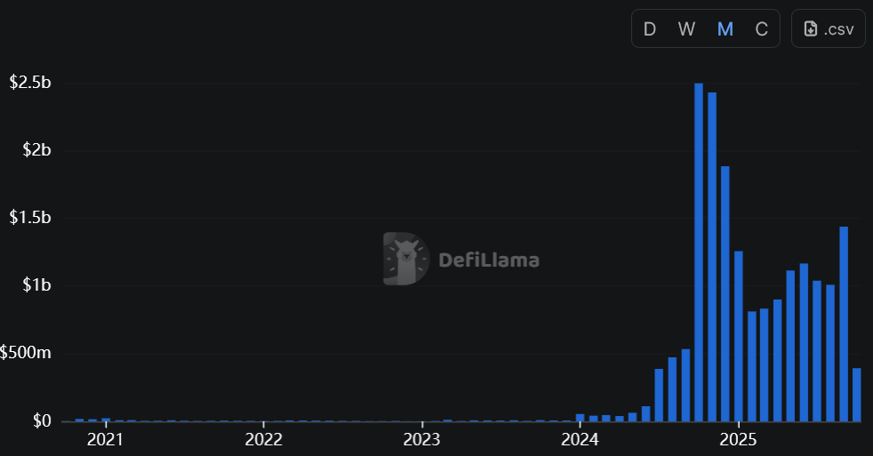 Обсяги торгів на ринках прогнозування охолонули їхні максимуми, але два найбільші платформи ринку прогнозування, полімаркет та Кальші, відповідно, побачили 1,43 мільярда доларів та 2,74 мільярда доларів у вересні, що перевершило їхній попередній комбінований запис минулого листопада, показують дані Defillama.
