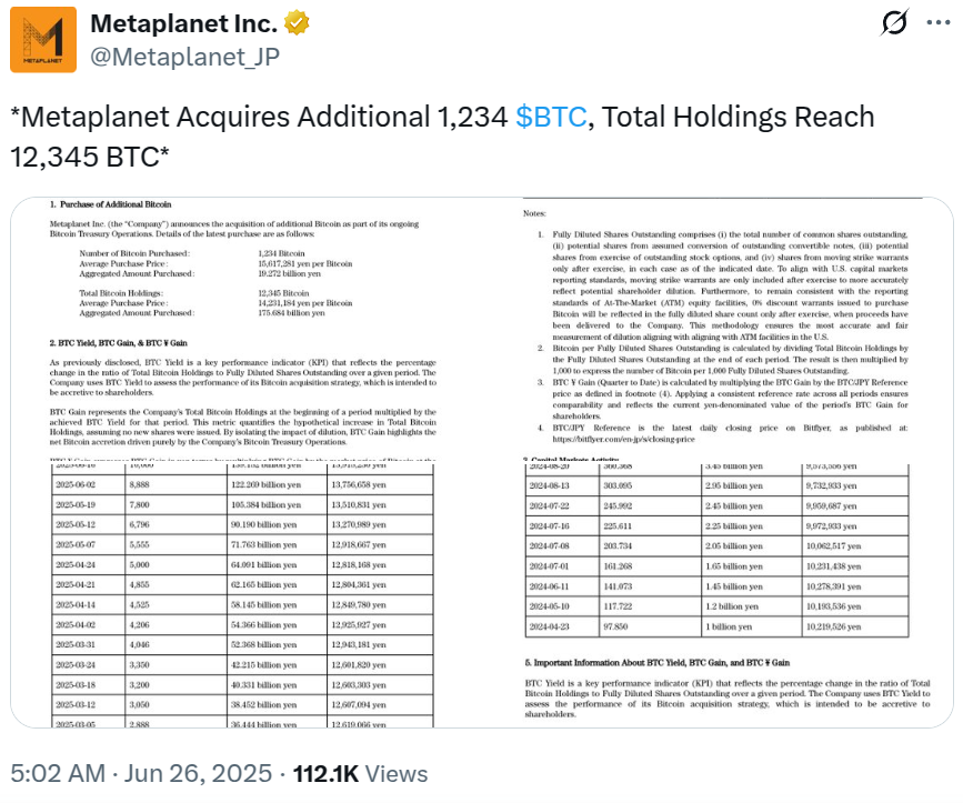 Metaplanet, найбільша корпоративна казначейство Bitcoin в Японії, оголосила сьогодні, що придбала додаткові 1,234 біткойн, що призвело до загальної кількості його акцій до 12 345 BTC.