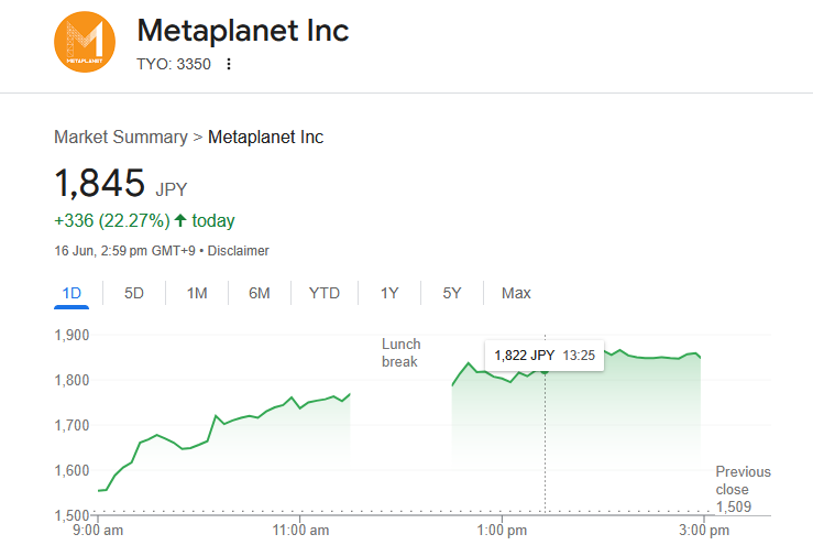 Оголошення “назад до спини” побачила, що ціна акції Metaplanet різко зростає протягом дня.