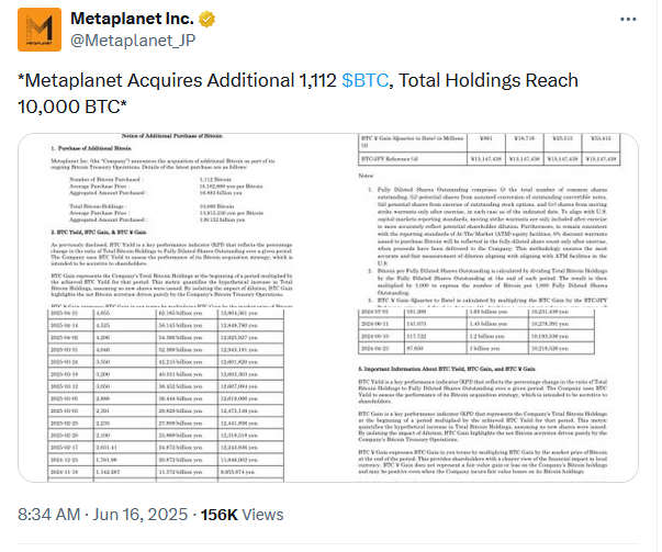 Середня ціна 10 000 BTC Metaplanet зараз становить 13,9 мільйонів японських ієн, приблизно 96 400 доларів за біткойн.