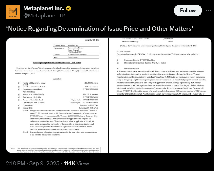 Акції продаватимуться через міжнародну пропозицію за межами Японії на 553 ієн (3,75 долара) кожен, зібравши приблизно 212,9 мільярда ієн (1,44 мільярда доларів), повідомляє компанія. Ціна випуску становить знижку на 9,9% на ціну закриття Metaplanet у вівторок 614 ієн.