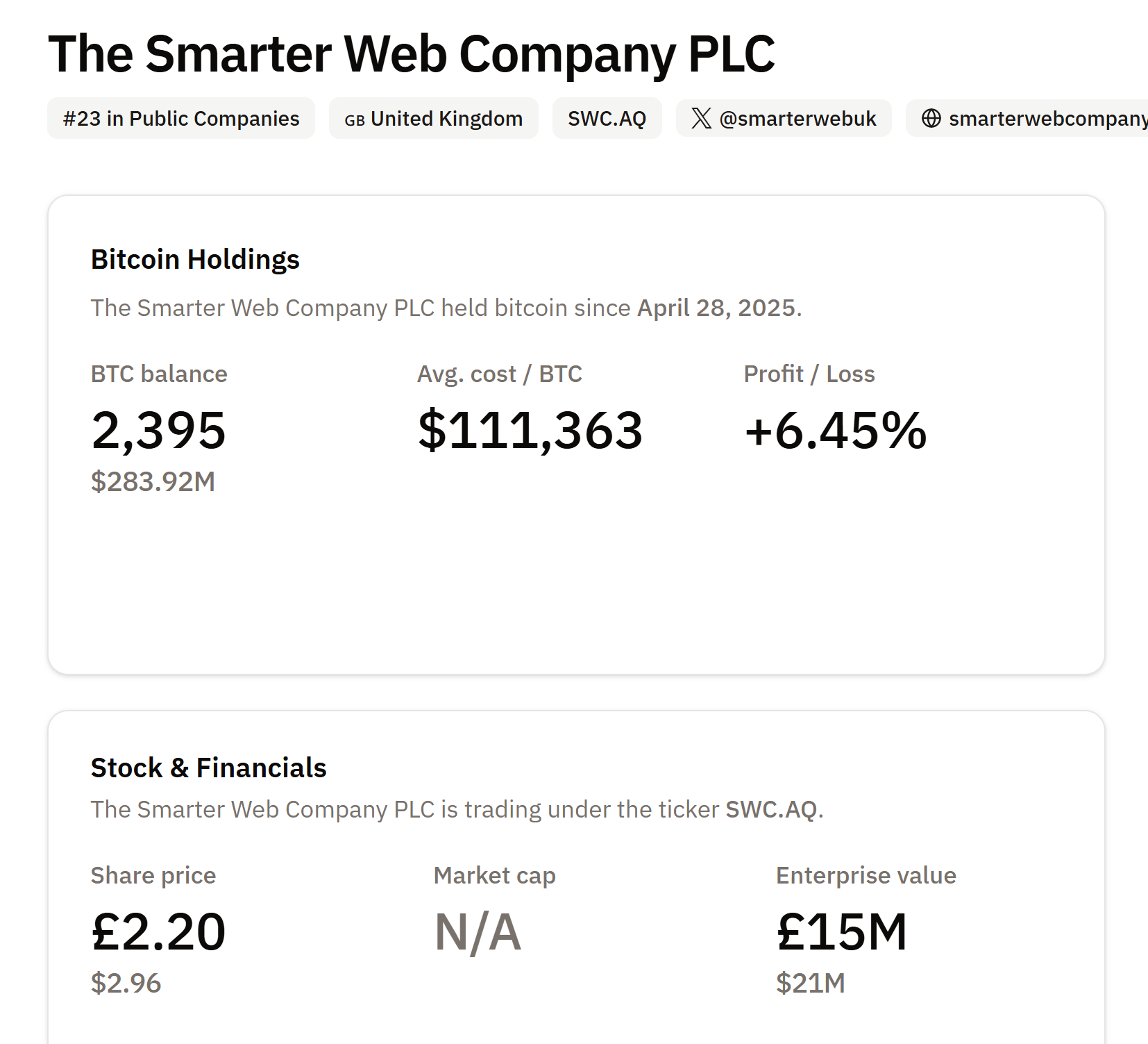 Розумніша веб-компанія, веб-дизайн, що перераховується в Лондоні, та фірма з казначейства Bitcoin, також виявила у вівторок, що вона придбала 295 BTC за 26,3 мільйона фунтів (35,2 мільйона доларів) в середньому 119 412 доларів.