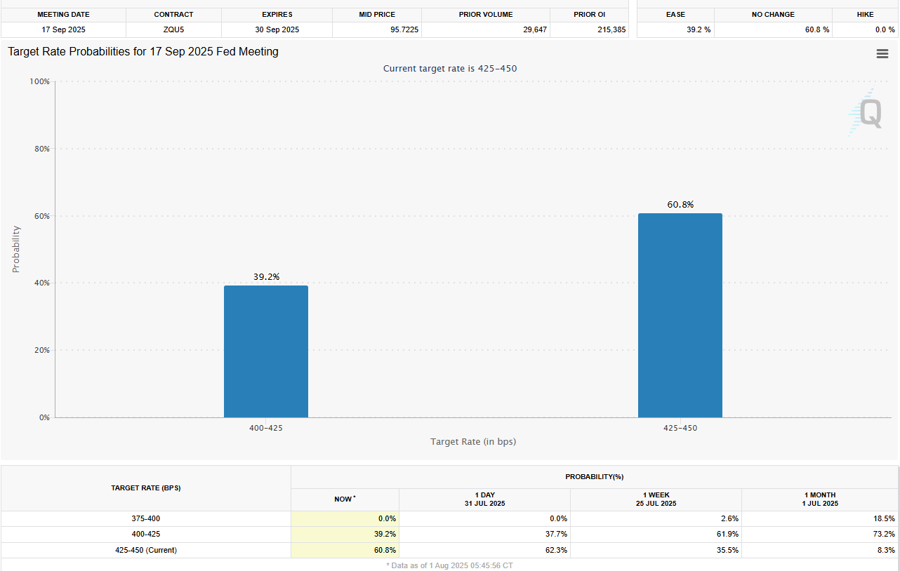 Тим часом, ринки в даний час мають ціни на 60,8%, що ФРС підтримуватиме процентні ставки під час наступного федерального засідання комітету з відкритих ринку 17 вересня, згідно з останніми оцінками інструменту FedWatch Group.