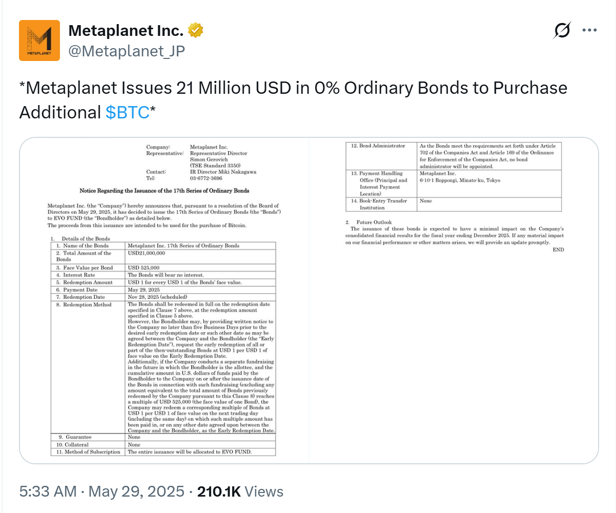 Metaplanet постійно пробирав ринок боргу для фінансування закупівель Bitcoin (BTC), зібравши 25,9 мільйонів доларів у лютому, 13,3 мільйона доларів у березні та 25 мільйонів доларів на початку травня.
