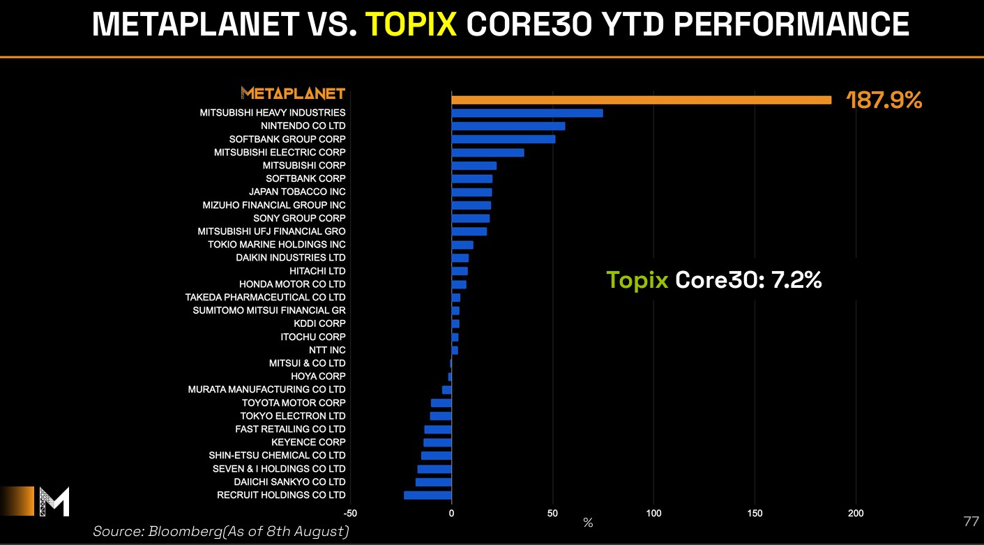 У звіті було показано, що приріст YTD Metaplanet перевищив навіть найефективніші члени Topix Core 30, включаючи Mitsubishi, Nintendo та Softbank Group. Ці компанії розміщували двозначні прибутки протягом того ж періоду часу, але все ще відставали від метапланету з широкими маржами.