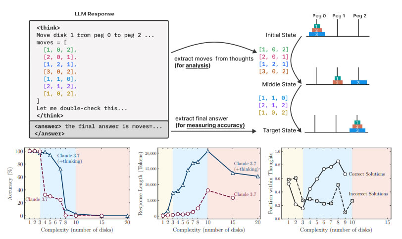 Вони виявили, що “прикордонні ЛРМ стикаються з повним крахом точності, що перевищує певні складності”, не узагальнюйте міркування ефективно, і їх перевага зникає зі зростанням складності, що суперечить очікуванням можливостей AGI.