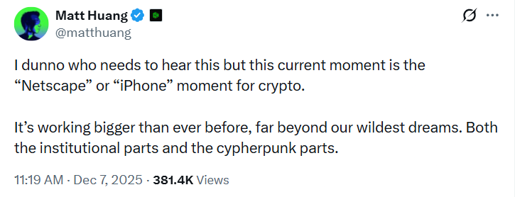 За словами співзасновника Paradigm Метта Хуанга, індустрія криптовалют наближається до свого «моменту Netscape», оскільки постійний прогрес у інфраструктурі блокчейну та зростання регульованих інвестиційних продуктів спричиняє нову хвилю інституційного впровадження.