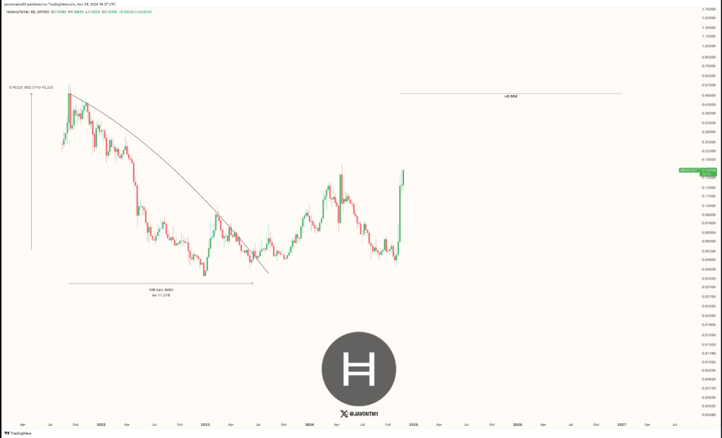 Нативна монета Hedera Hashgraph, HBAR, стала предметом розмов на ринку криптовалют після вражаючого зростання ціни. За чотири тижні монета змінила ведмежий тренд, який зберігався більше 1000 днів. У зв’язку зі збільшенням інтересу інвесторів експерти посилаються на високі прогнози цін, що свідчить про зростання довіри до цієї публічної книги корпоративного рівня.