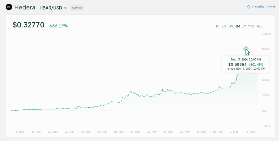 Ціна HBAR становила $0,3173 на момент написання. Навіть незважаючи на те, що монета втратила 10% за останні 24 години, вона показала хороші результати протягом тижня та місяця. Примітно, що за останні 30 днів HBAR зберіг величезне зростання на 801%, що дуже порадувало покупців.
