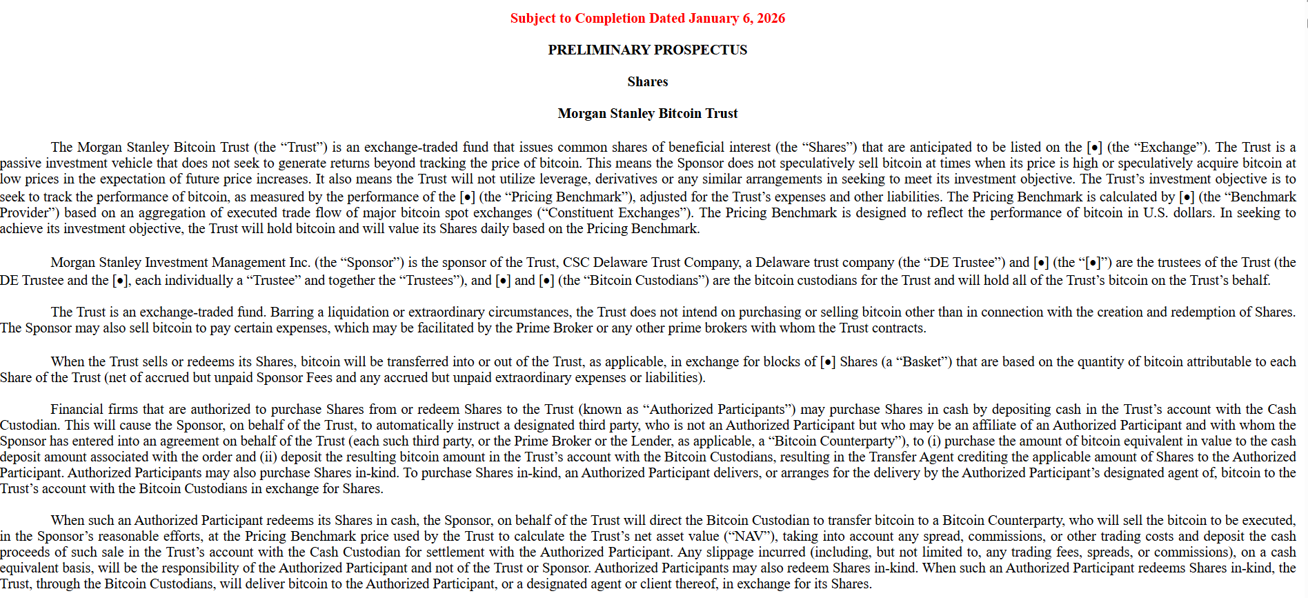 Запропоновані Morgan Stanley Bitcoin (BTC) Trust і Morgan Stanley Solana (SOL) Trust функціонуватимуть як «пасивні інвестиційні» засоби, які зберігають і відстежуватимуть ефективність базових токенів, згідно з документами, наданими у вівторок SEC.