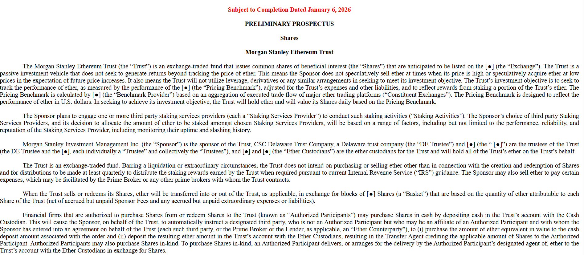 Інвестиційний банк США подав форму S-1 для заснування Morgan Stanley Ethereum Trust, ETF, який прагне купувати, утримувати та відстежувати ціну спотового ефіру (ETH), згідно з поданням у вівторок до SEC.