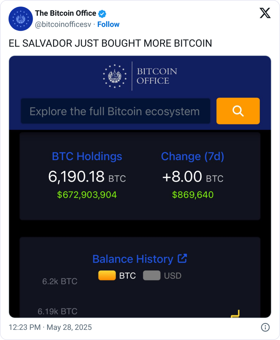 Незабаром після оголошення МВФ 27 травня, офіс біткойна Сальвадора опублікував у X, що країна знову придбала більше біткойна.