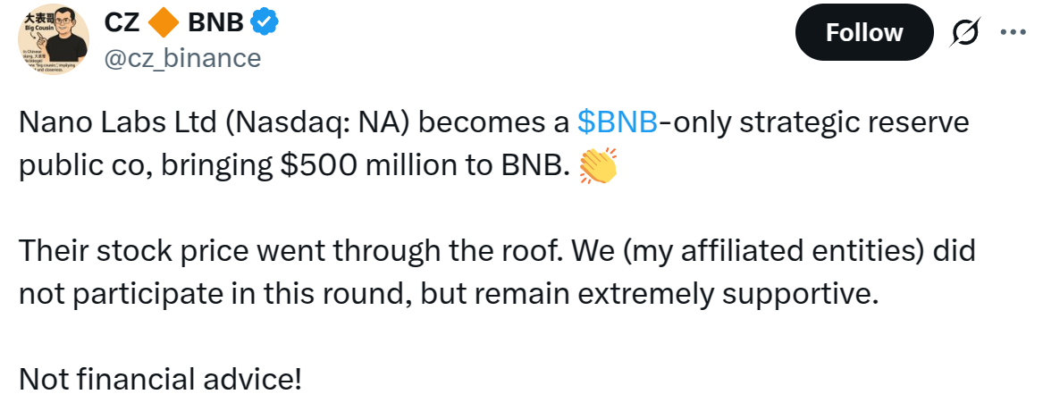 Співзасновник Binance та колишній генеральний директор Changpeng “CZ” Чжао поділився оголошенням Nano Labs у пості X. Далі він підкреслив, що “акції фірми пройшли через дах” після оголошення ініціативи резервів BNB.