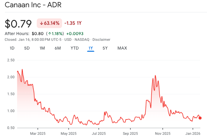 Canaan завершив торги в п’ятницю на рівні 0,79 долара, знизившись на 3,8% за день. Її акції не торгувалися вище 3 доларів з грудня 2024 року.
