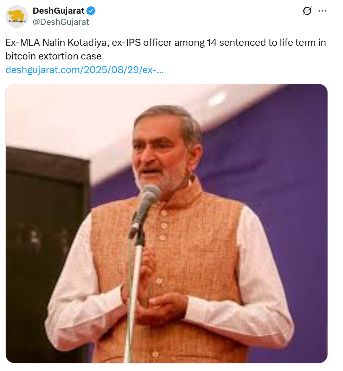 Індійський антикорупційний суд засудив 14 осіб, у тому числі 11 чиновників поліції та колишнього члена законодавчих зборів Бхаратія Джаната (БДП) у справі про довічне ув’язнення у справі, що передбачає викрадення та заглиблення криптовалюти у бізнесмена, що базується в SURAT у 2018 році.