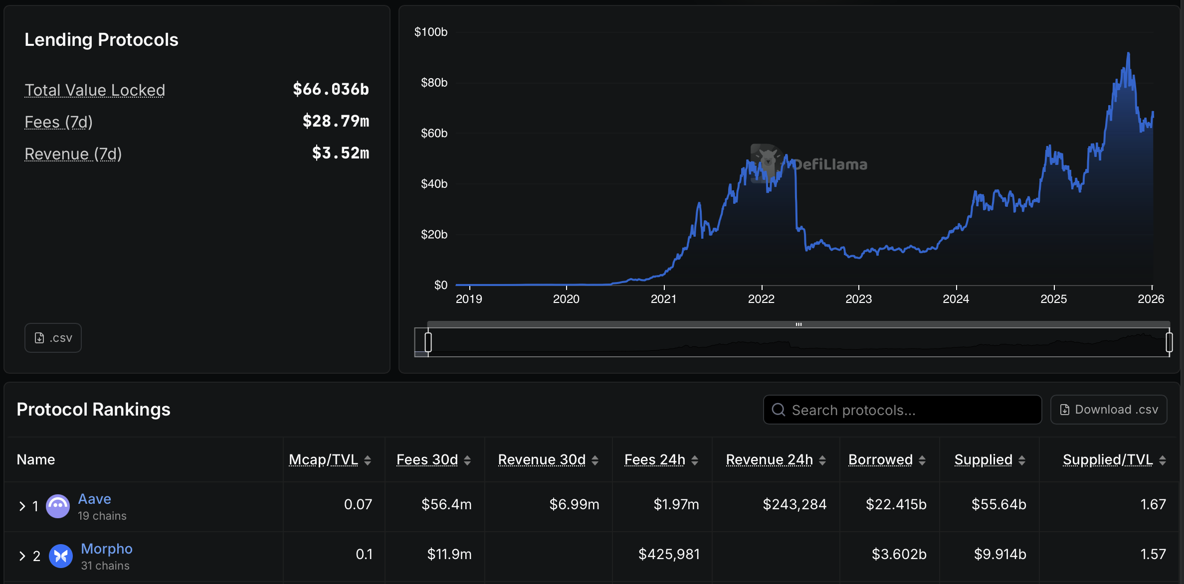 Згідно з даними DefiLlama, ринок кредитування DeFi лідирує з Aave з непогашеними кредитами на суму понад 22 мільярди доларів США, забезпеченими депонованими активами на суму понад 55 мільярдів доларів.