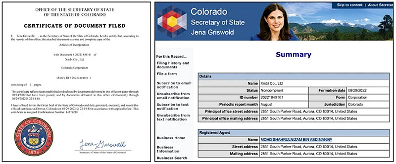Скріншоти, що показують включення Xinbi Co. Ltd в штат США Колорадо. Джерело: Еліптик