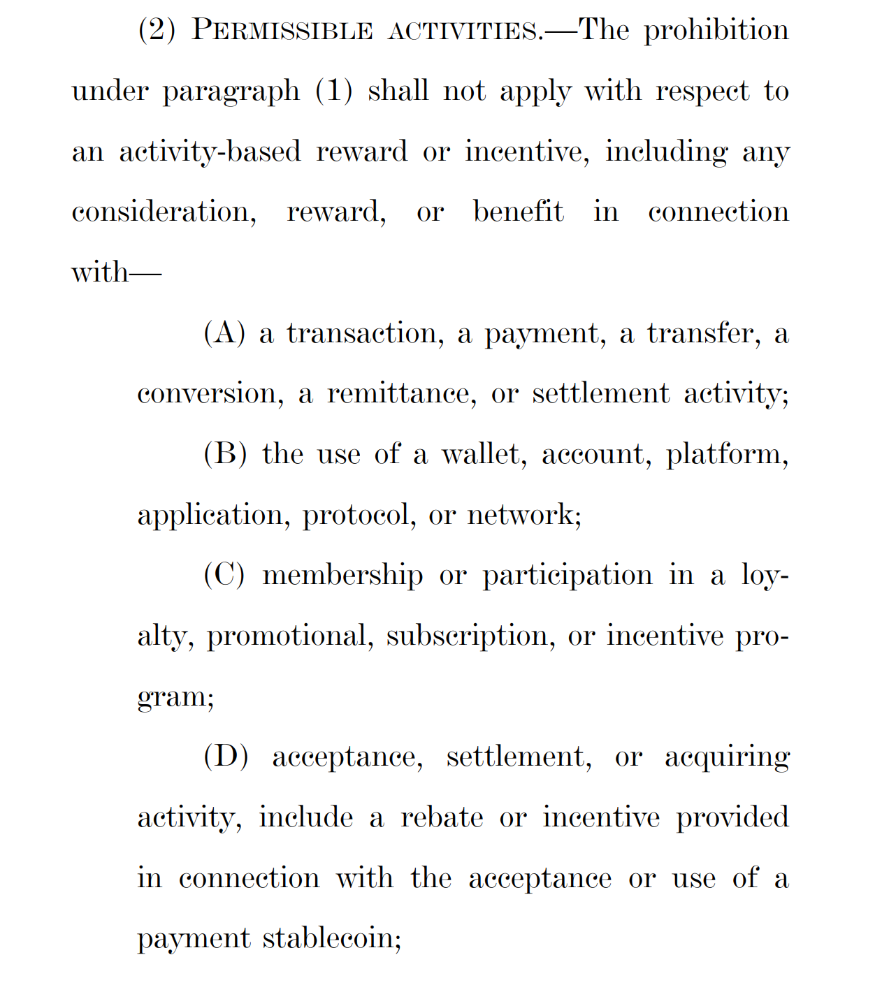 Відповідно до проекту, заборона не поширюватиметься на стимули, пов’язані з повсякденною фінансовою діяльністю. До них належать винагороди, пов’язані з платежами, переказами, грошовими переказами та розрахунками, а також переваги, пов’язані з використанням гаманців, облікових записів, платформ або мереж блокчейн. Також охоплюються програми лояльності та рекламні програми, стимули на основі підписки та знижки, пов’язані з використанням стейблкойнів.