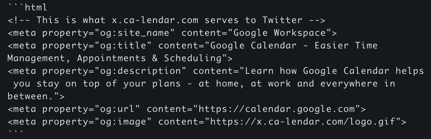 Домен, на який посилається повідомлення, є “X (.) Ca-Lendar (.) Com” і був зареєстрований 20 вересня. Все-таки X показує законний календар.google.com у попередньому перегляді завдяки метаданам сайту, що використовує, як X генерує попередні перегляди зі своїх метаданих.
