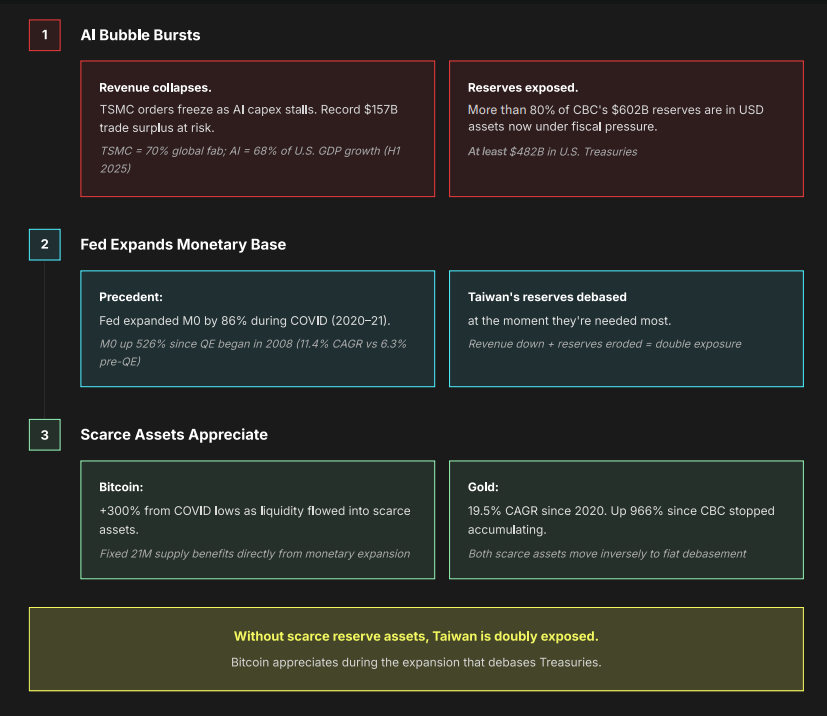 «Унікальний для Тайваню біткойн забезпечує геополітичну стійкість: під час блокади або вторгнення КНР золото потрапляє на мілину або вилучається, а резерви доларів США стикаються з потенційними обмеженнями, але біткойн залишається повністю доступним без фізичного транспортування», — додав він.