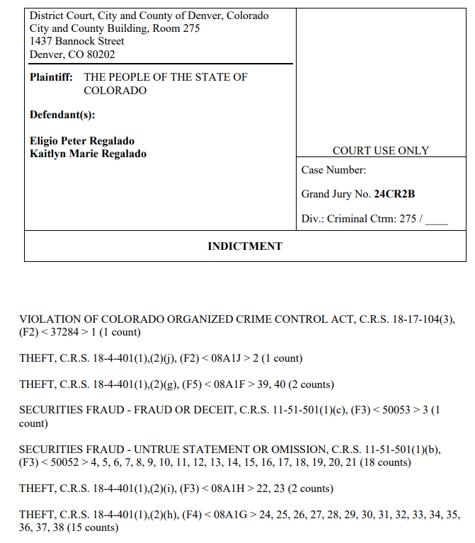 Пастор в Інтернеті Елі Регаладо та його дружина Кейтлін були звинувачені у 40 пунктах, що випливають із того, що прокурор округу Денвер Джон Уолш описав як “багатомільйонну аферу з криптовалютою”.