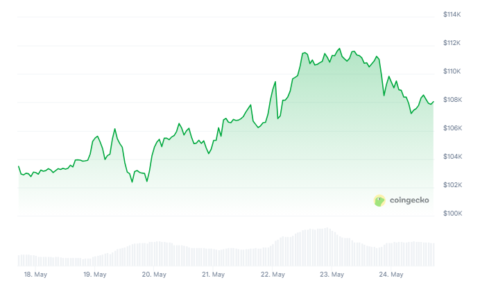 21 травня інвестори додали 607 мільйонів доларів, того ж дня біткойн досяг нового піку. Потім, 22 травня, монета зросла до 111 980 доларів. Ці кроки показують гроші, що переслідують свіжі максимуми.