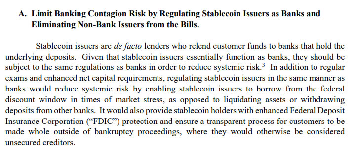 “Враховуючи, що емітенти StableCoin по суті функціонують як банки, вони повинні бути піддані тим самим правилам, що і банки, щоб зменшити системний ризик”.
