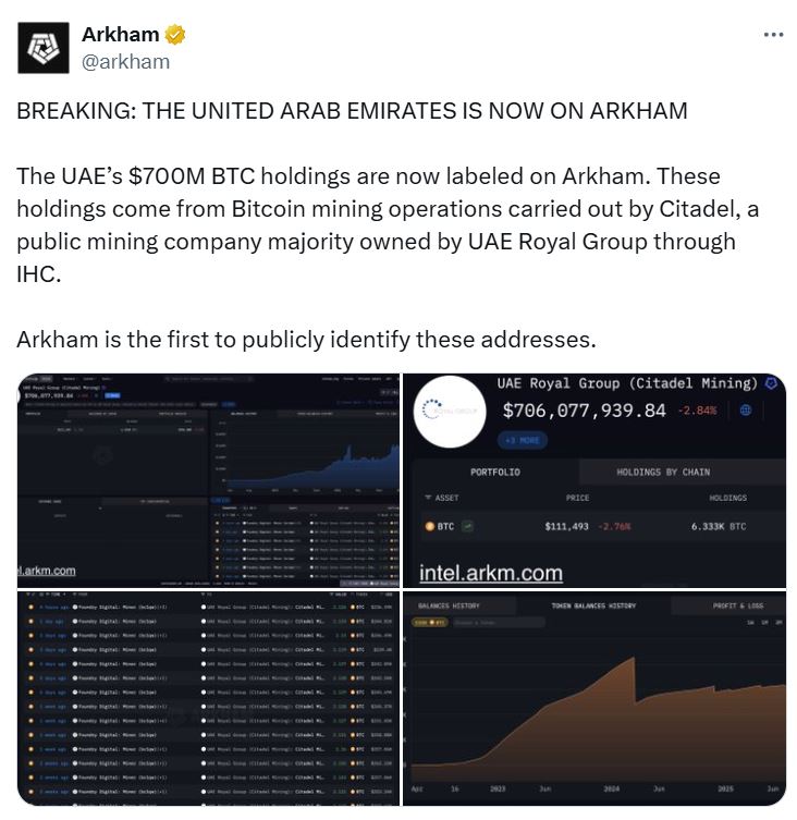 Аркхем заявив у понеділок у X в понеділок, що він став одним із перших, хто публічно визначив гаманці уряду ОАЕ, виявивши, що їхні адреси гаманця мають близько 6300 біткойна (BTC).